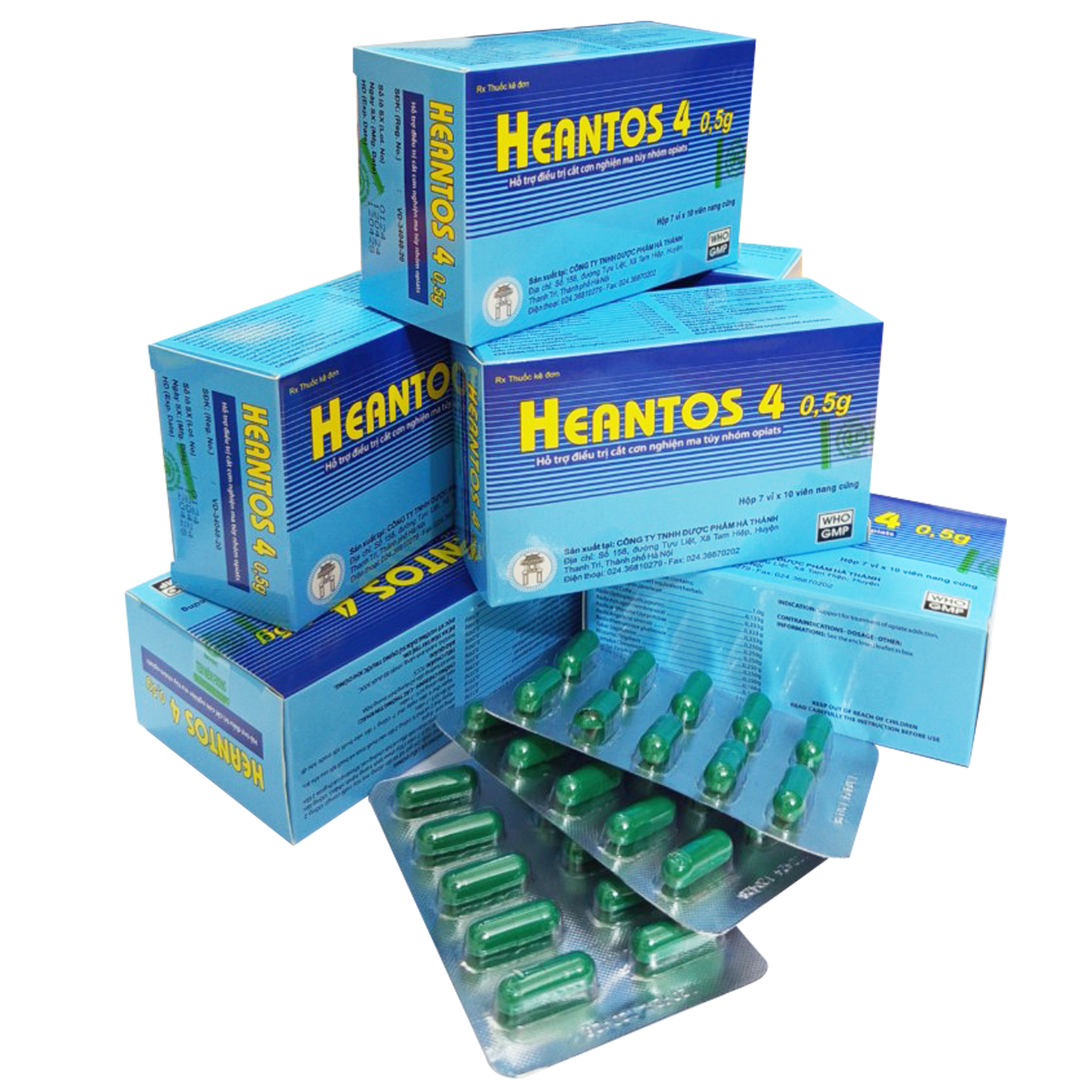 Thành phần của thuốc gồm: Phòng đẳng sâm: 1,0g, A giao: 0,133g, Mạch môn: 0,333g, Hoàng kỳ: 0,333g, Cam thảo: 0,333g, Đương quy: 0,25g, Sinh địa: 0,25g, Bình: 0,25g, Gừng: 0,25g, Quế chi: 0,25g, Đại táo: 0,25g, Táo nhân: 0,166g, Viễn chí: 0,166g, Talc: 0,01g. Tác dụng: Hỗ trợ cắt cơn cai nghiện ma túy, dưỡng tâm, an thần, định trí, phục hồi thải độc, cân bằng hệ thần kinh. Công dụng: Thuốc Heantos 4 hỗ trợ cắt cơn bình ổn các hội chứng trong quá trình cai nghiện, giúp an thần, định trí, đào thải các chất ma túy ra khỏi cơ thể, cường gan thận, giảm thèm nhớ ma túy, phục hồi sức khỏe cho người nghiện. Qua nhiều năm nghiên cứu đội ngũ chuyên gia đã phân tích và đưa ra các liệu trình thuốc kết hợp để hỗ trợ cai thuốc phiện đen, heroin, đá, cỏ, cần sa, thuốc lắc, thuốc lá điện tử... Liều dùng: Liều dùng thuốc Heantos 4 0,5g được đăng ký Bộ Y Tế - Ngày 1: Sáng uống 7 viên, tối uống 7 viên. - Ngày 2: Sáng uống 7 viên, tối uống 7 viên. - Ngày 3: Sáng uống 7 viên, tối uống 7 viên. - Từ ngày thứ 4 trở đi uống 7 viên vào buổi tối. Ưu điểm: An toàn lành tính, dễ sử dụng, dạng cao có mùi thơm. Lưu ý: - Sử dụng thuốc phải tuân theo hướng dẫn của Bác Sĩ có chuyên môn. - Trên thực tế liệu trình kết hợp để cai các loại ma túy khác nhau sẽ có liều dùng khác nhau. - Trong quá trình cai không cho người nghiện sử dụng các thuốc có tiền chất ma túy. - Không nên tiêm truyền trong quá trình cai. - Cai nghiện ma túy là một quá trình phức tạp nên khi gia đình có người nghiện nên tìm hiểu kỹ, và cần có sự tư vấn chuyên sâu, theo dõi của bác sĩ có chuyện môn trong suốt quá trình cai.